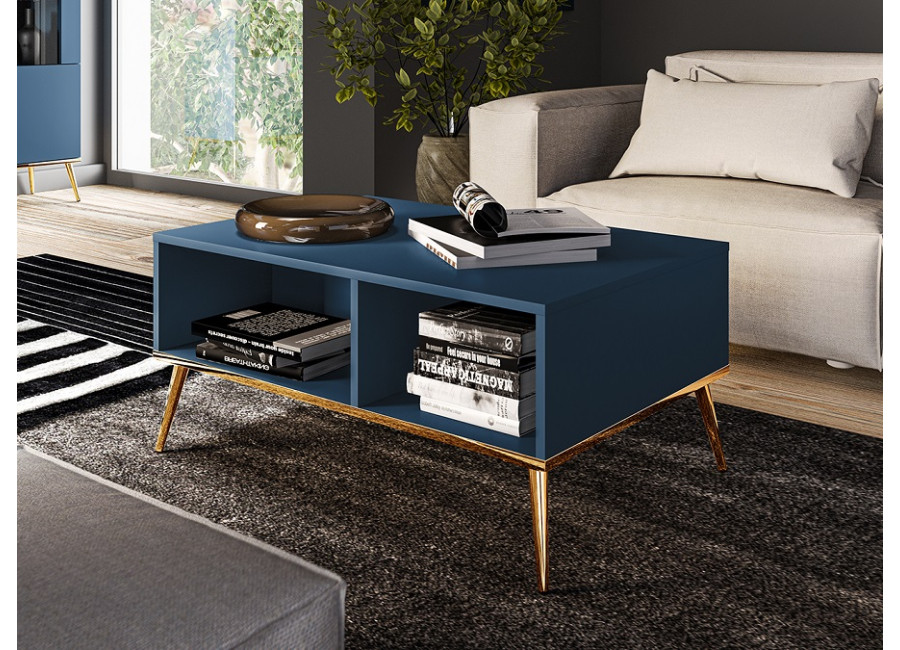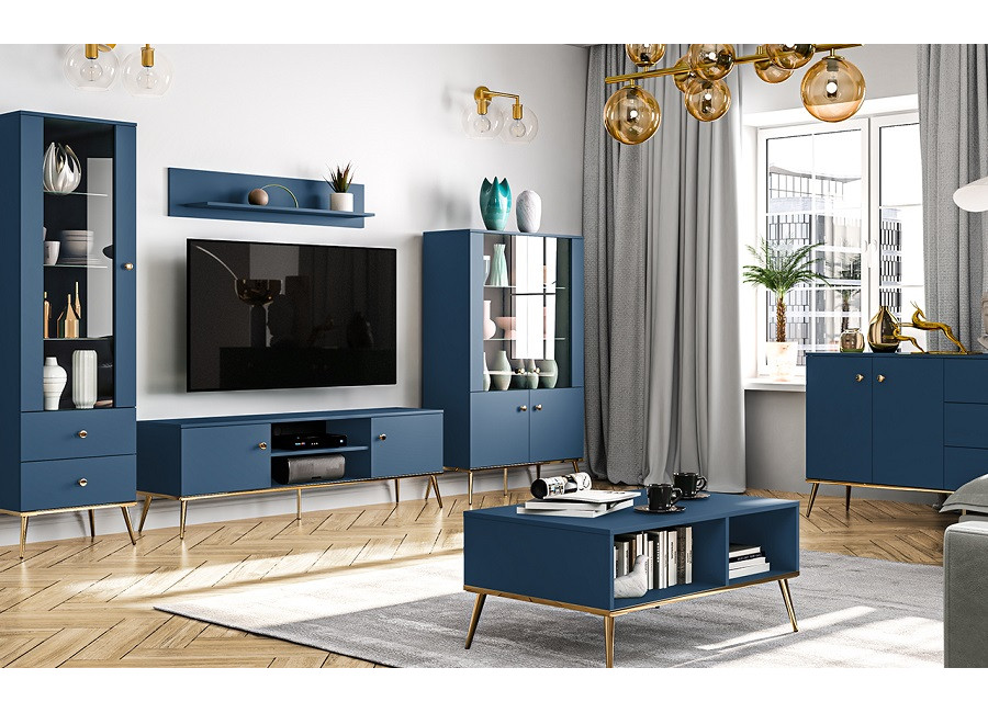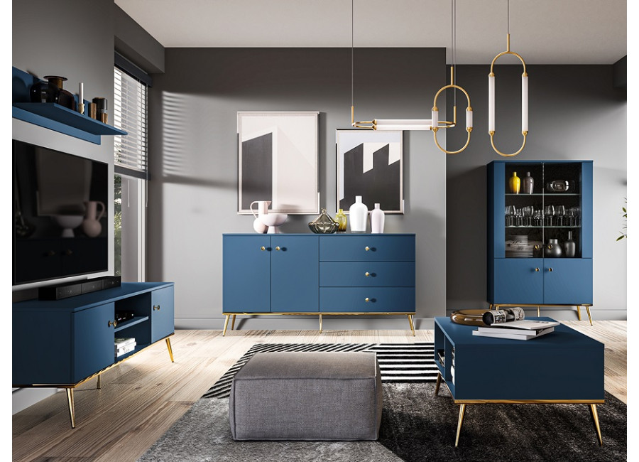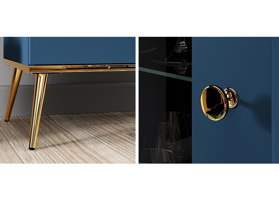 MARINE je jedinečný nábytok, ktorý vnáša do interiéru eleganciu a luxus. Tmavomodrá farba v kombinácií so zlatými detailami dodáva celému systému tajomný a elegantný charakter. Úchytky a nožičky sú kovové, dvierka majú závesy s tichým zatváraním.