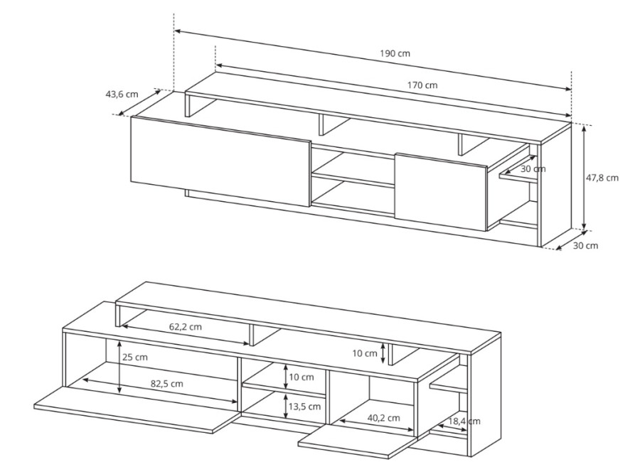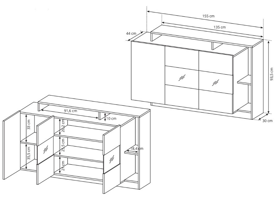 Komoda: výška: 93,5 cm, šírka: 155 cm, hĺbka: 44 cm.