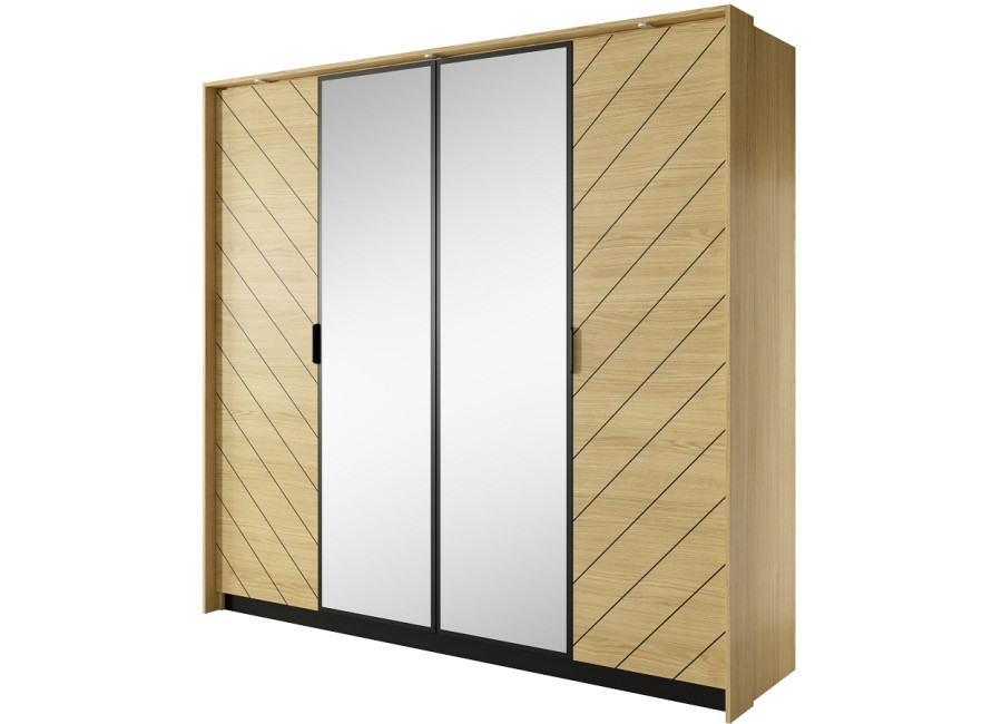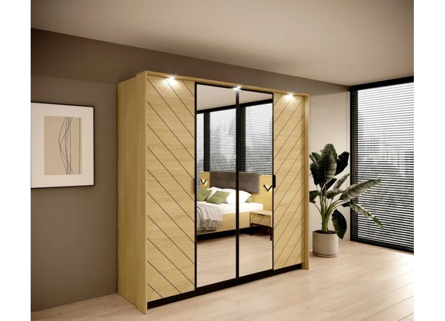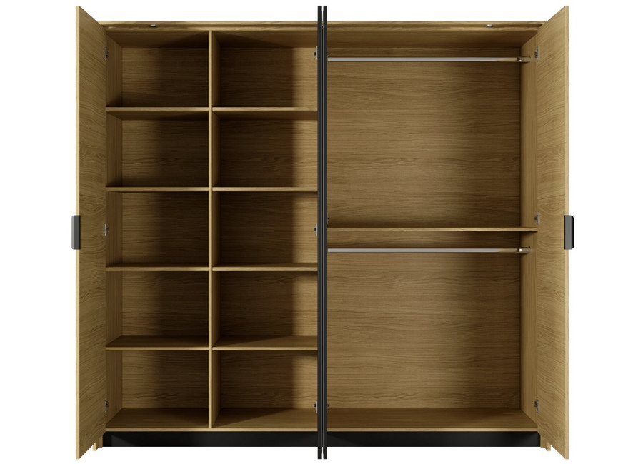Spálňa VARADERO je vyrobená z kvalitnej laminovanej drevotriesky s ABS hranami. Čierne drážkovanie na dvierkach šatníka, nočných stolíkoch a komode dodáva nábytku originalitu a jedinečnosť. Prírodná farba dub scandi perfektne kontrastuje s čiernou farbou. Určite oceníte aj kovové nožičky na komode a nočných stolíkoch, najmä pri upratovaní.