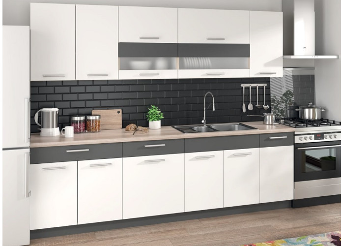 S kuchynskou linkou 260cm MODENA biely lesk/grafit získate nielen kúsok nábytku, ale celú filozofiu bytového dizajnu, ktorá každodenné varenie premení na radostnú a inšpirujúcu činnosť. Urobte z Vašej kuchyne srdce domova s kuchynskou linkou, ktorá nikdy nevyjde z módy.