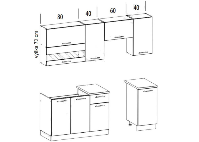 - dolné skrinky: T24/D80Z + T-16/D40S1 + T-15/D40 + pracovná doska 40cm (2ks) + sokel T31 + sokel T32 ľavý a pravý
