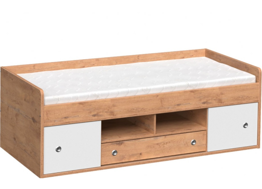 Detská posteľ 90x200 s úložným priestorom REA POPPO je vyrobená z vysokokvalitnej laminovanej drevotriesky v hrúbke 25 mm a 16 mm. Táto posteľ do detskej izby je navrhnutá tak, aby poskytovala pohodlie a bezpečnosť malým aj väčším deťom. Je vybavená zadným a bočnými čelami, pričom predné rohy bočníc sú zaoblené, čo zvyšuje jej bezpečnosť. Pod spacou plochou sa nachádza praktická úložná zásuvka, dvoje posuvné dvierka a dve poličky, ktoré ponúkajú dostatok priestoru pre uloženie detských potrieb.