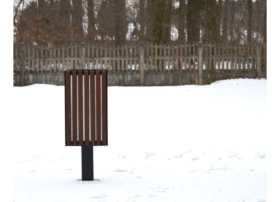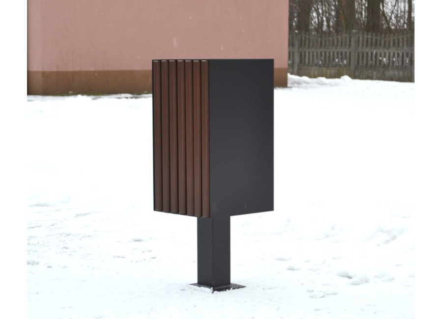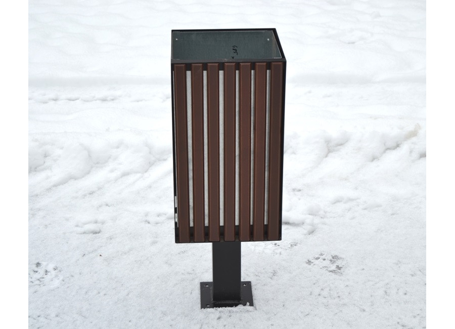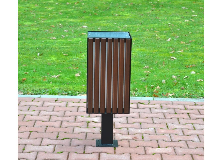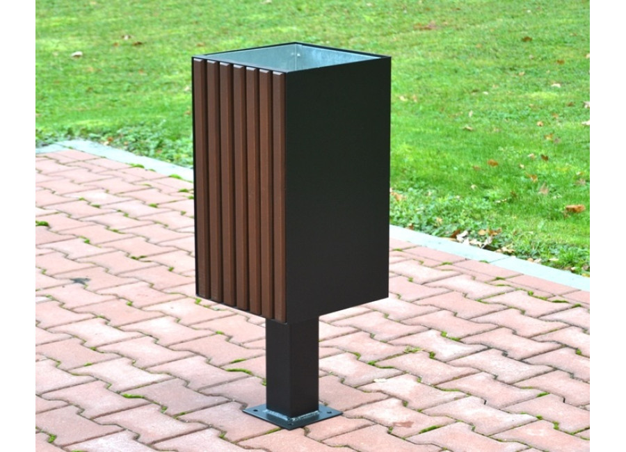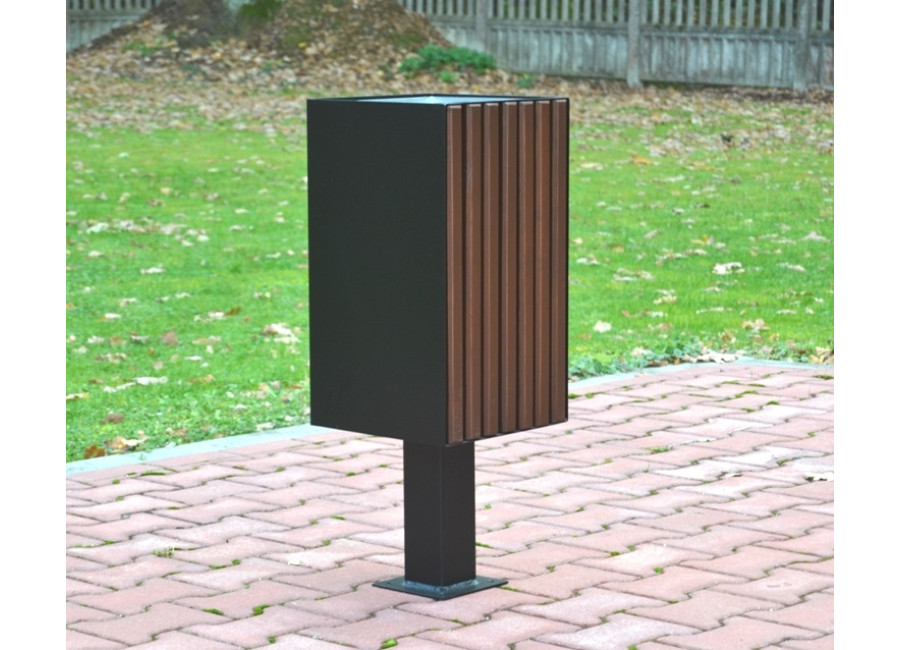 Kôš je postavený na jednej nohe a je vyrábaný z odolného oceľového plechu. Celá konštrukcia je farbená čiernou antikoróznou farbou s práškovým nástrekom, čo poskytuje extra ochranu proti poveternostným vplyvom. Pred samotným lakovaním sú všetky oceľové časti odpadkových košov pozinkované, čo ešte viac zvyšuje ich odolnosť voči korózii.