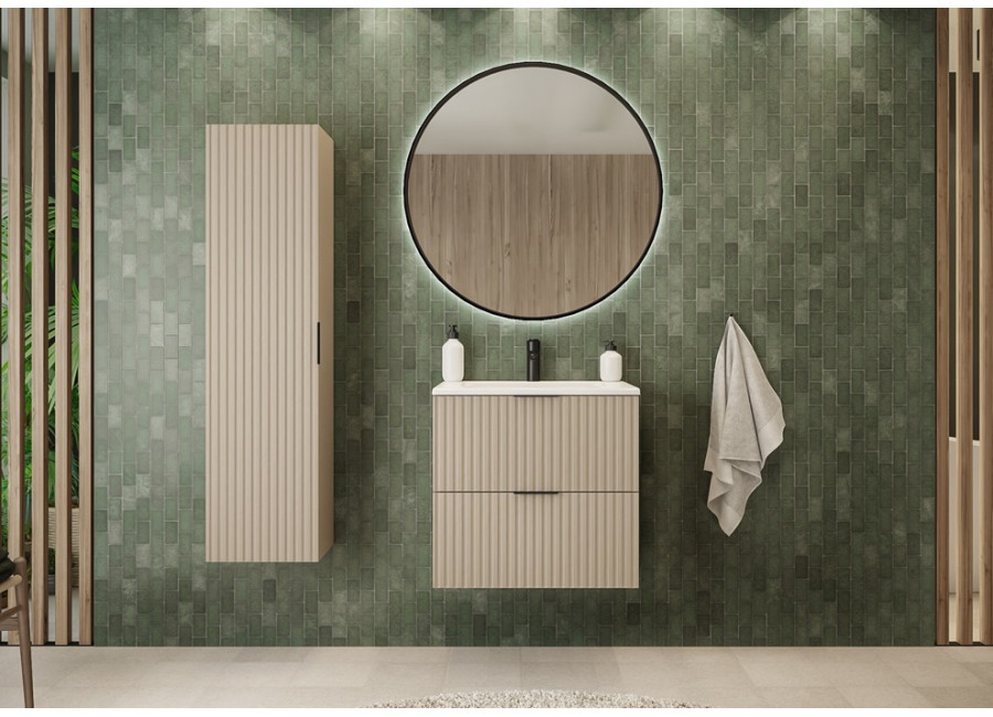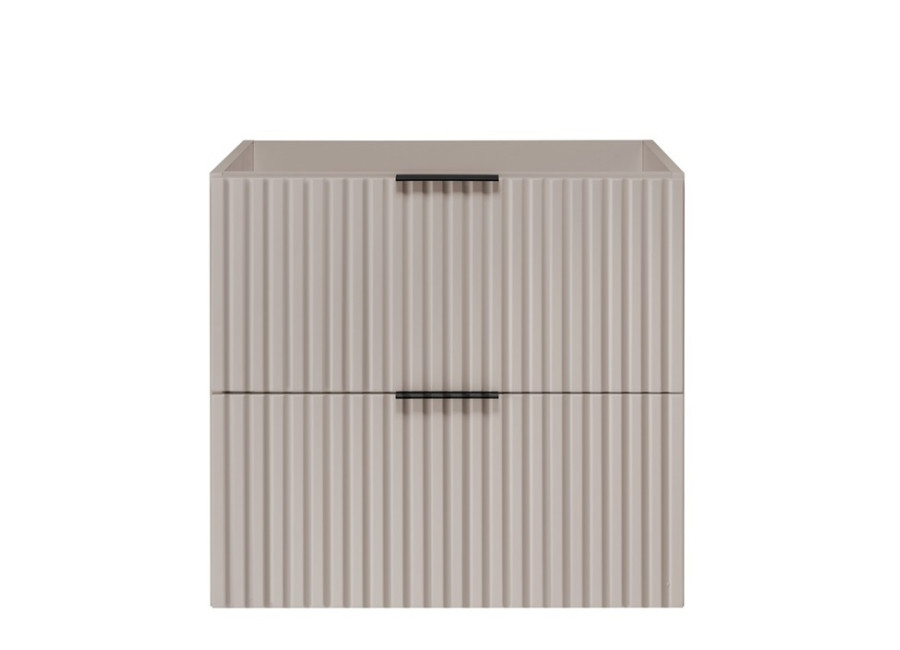 Predstavujeme Vám závesnú skrinku pod umývadlo FLOW K60 vo farebnom prevedení kašmír. Táto kúpeľňová skrinka je ideálnym riešením pre moderné a štýlové kúpeľne. Je zhotovená z laminovanej drevotriesky s hrúbkou 16 mm. Dvierka sú vyrobené z MDF materiálu, ktorý zaručuje dlhú životnosť a elegantný vzhľad. Zaujať Vás môžu moderné drážkované čielka zásuviek so systémom Soft Close, ktorý zabezpečuje tiché dovieranie. K dispozícii sú dve úchytky v čiernej a zlatej farbe – výber je len na vás, pri montáži si zvolíte, ktorá farba lepšie ladí s Vaším interiérom. Vrchná doska a umývadlo nie sú zahrnuté v cene skrinky. To Vám dáva možnosti — môžete si vybrať buď zápustné umývadlo alebo vrchnú dosku s vrchným umývadlom.