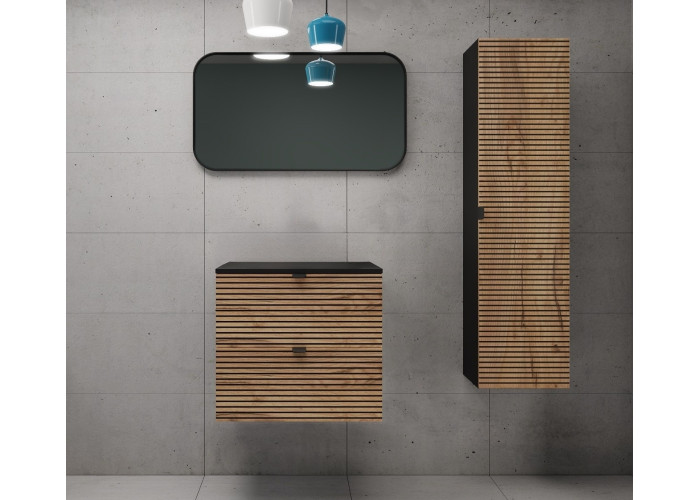 Centrálnym prvkom zostavy je závesná skrinka pod umývadlo LOFT C60, ktorá vyniká dvoma priestrannými zásuvkami so systémom Soft Close. Tento mechanizmus zaručuje plynulé a tiché zatváranie, čím výrazne prispieva k pohodliu pri každodennom používaní a zároveň predlžuje životnosť nábytku. Skrinka v dekore dub craft zlatý, doplnená o čierne pásiky, vytvára moderný glamour vzhľad, ktorý zmení kúpeľňu na vyššiu úroveň. Vyrobená je z kvalitnej laminovanej drevotriesky s hrúbkou 16 mm, zatiaľ čo čelné plochy zásuviek sú z MDF materiálu, obohatené o štýlové horizontálne drážky.