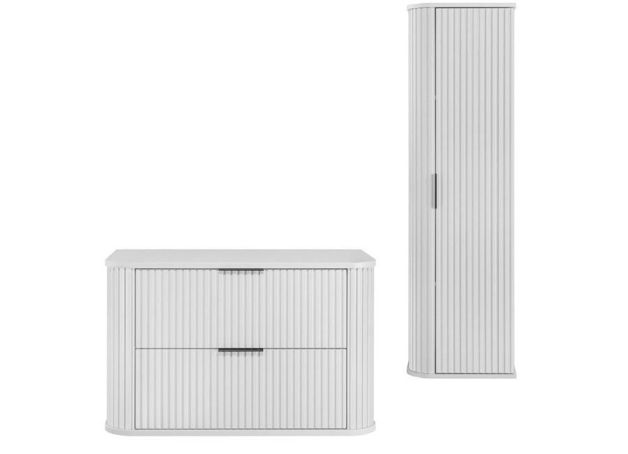ktoré poskytujú dostatok úložného priestoru na všetky Vaše potreby. Skrinka pod umývadlo je dodávaná bez umývadla, čo umožňuje flexibilitu pri výbere vhodného modelu podľa Vašich preferencií. Dizajn zostavy je charakteristický zaoblenými hranami a drážkovanými čelami a dvierkami, ktoré dodávajú nábytku elegantný vzhľad. Zásuvky sú vybavené technológiou Soft Close pre tiché zatváranie, čo zaručuje maximálny komfort pri každodennom používaní.
