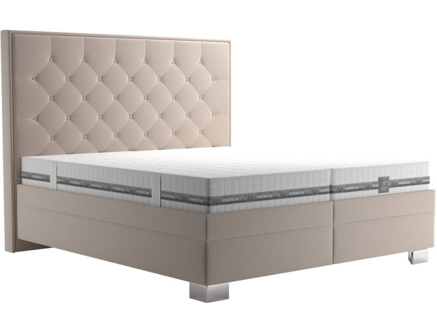 Posteľ REBEKA je čalúnená v jemnej béžovej látke, ktorá dodáva spálni nádych luxusu a elegancie. Dominantným prvkom je ozdobne prešité čelo postele, ktoré nielenže pôsobí esteticky, ale zároveň poskytuje pohodlie pri opretí počas čítania alebo relaxácie. Výška čela dosahuje 151 cm, čo z postele robí výrazný a štýlový prvok každej spálne.