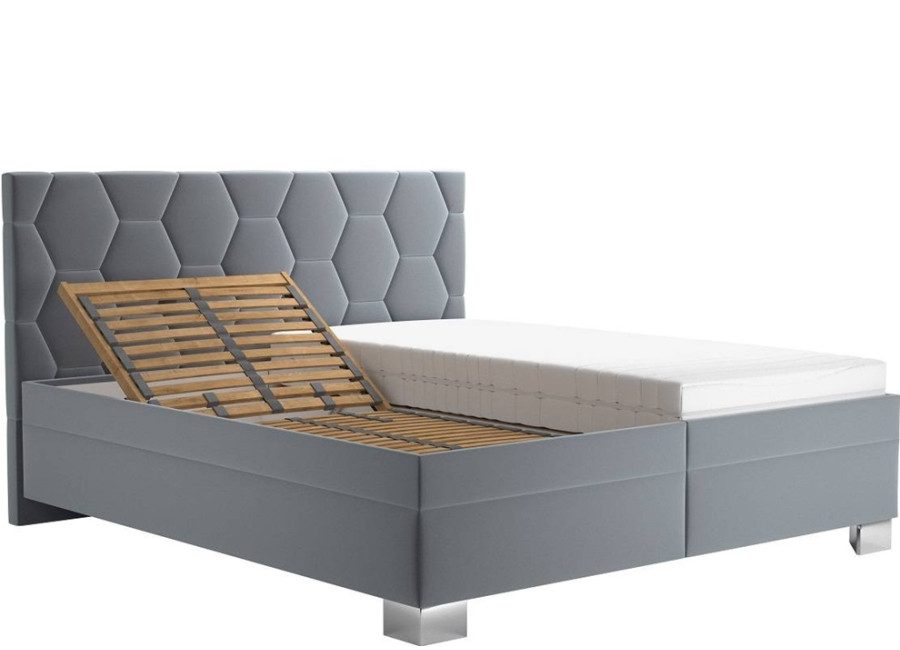 Posteľ PATRICIA zaujme na prvý pohľad svojím štýlovým vzhľadom. Čalúnená v elegantnej sivej zamatovej látke dodáva spálni nádych luxusu. Dominantným prvkom je ozdobne prešité čelo postele v tvare hexagonu, ktoré nielenže vyzerá esteticky príťažlivo, ale zároveň poskytuje pohodlnú oporu pri čítaní. Výška čela 117 cm podčiarkuje majestátnosť tejto postele a stáva sa stredobodom každej spálne.