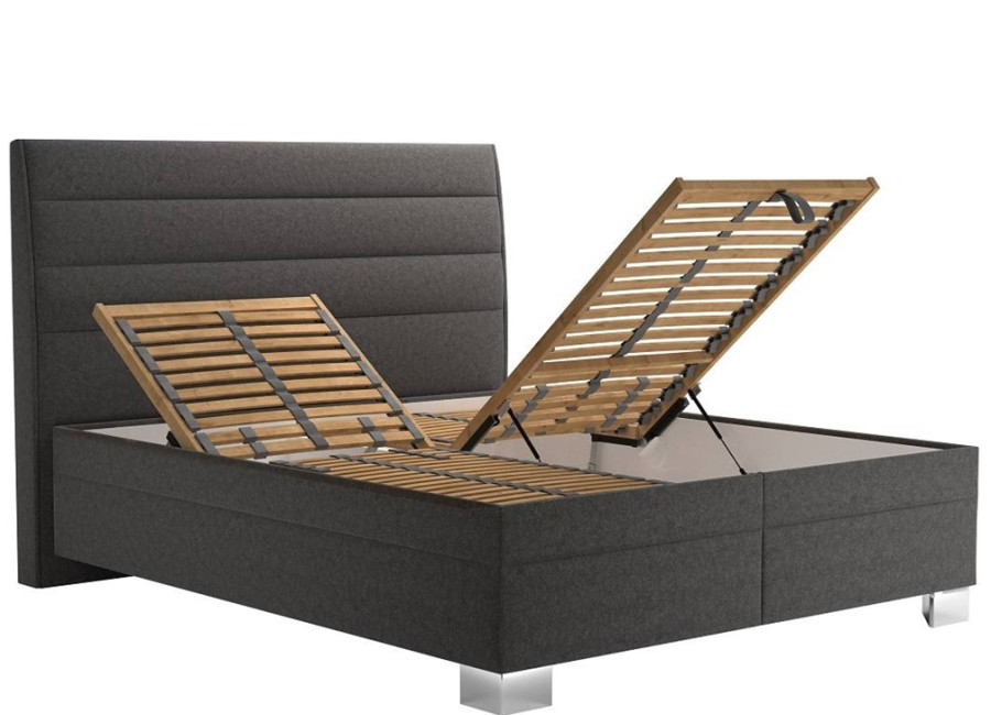 Sivá posteľ s úložným priestorom ponúka dostatok miesta na uloženie posteľnej bielizne, sezónneho oblečenia alebo iných predmetov. Prístup do úložného priestoru je veľmi jednoduchý vďaka plynovým piestom, ktoré umožňujú pohodlné otváranie od nôh postele.