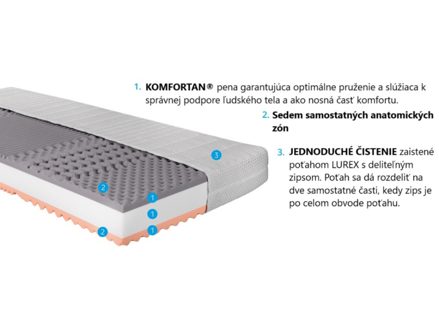 Tento matrac na posteľ využíva flexibilnú penu KOMFORTAN®, ktorá zabezpečuje vynikajúce odvetrávanie a prirodzenú reguláciu teploty počas spánku. Obojstranné zónové profilovanie podporuje správne prekrvenie pokožky a pomáha udržiavať chrbticu v optimálnej polohe.