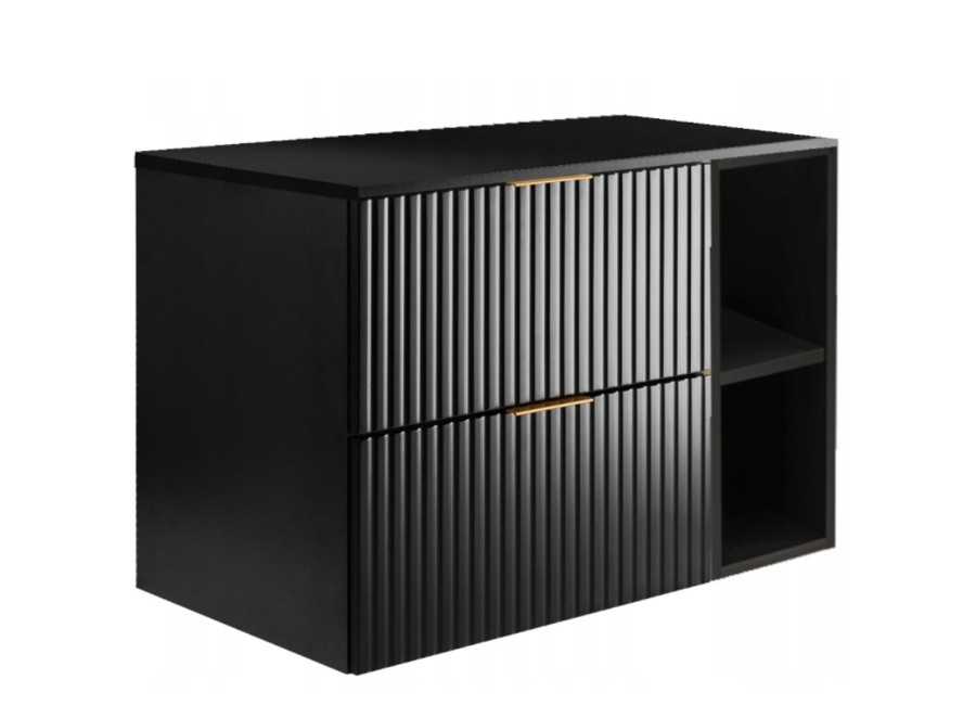 Je vyrobená z kvalitnej laminovanej drevotriesky s odolnými ABS hranami a MDF materiálu, ktoré zabezpečujú ochranu nábytku pred vlhkosťou, čím zaisťujú jeho dlhú životnosť. Farebné prevedenie skrinky je čierna matná, pričom vnútorné časti zásuviek sú elegantne ladené do svetlosivej farby. Priestranné zásuvky disponujú guľôčkovými ložiskami s funkciou SOFT CLOSE, teda tichým zatváraním, ktoré poskytuje užívateľovi maximálne pohodlie a jemnosť pri každom otváraní a zatváraní. Horná zásuvka bola špeciálne navrhnutá na použitie plochého sifónu, čo umožňuje efektívne a praktické využitie úložného priestoru. Kúpeľňová skrinka je určená na zavesenie na stenu, čo dodáva kúpeľni moderný a čistý vzhľad. Súčasťou balenia sú dve sady úchytiek v zlatej a čiernej farbe, takže si môžete zvoliť variant, ktorý najlepšie zodpovedá Vášmu vkusu. Vrchná doska je súčasťou skrinky. Plochý sifón a umývadlo je potrebné zakúpiť samostatne, nájdete ich v našej ponuke.