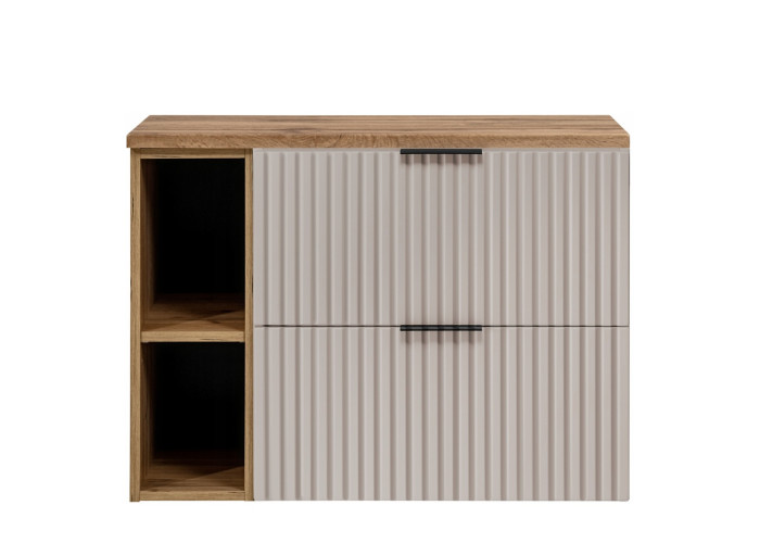 Kúpeľňová skrinka je vyrobená z kvalitnej laminovanej drevotriesky s ABS hranami. Čielka zásuviek sú z MDF materiálu odolného voči vlhkosti. Kašmírové farebné prevedenie dotvára elegantný vzhľad, ktorý krásne zapadne do konceptu béžových kúpeľní. Vnútro zásuviek je vyhotovené v svetlosivej farbe. Skrinka je určená na zavesenie na stenu, čím vytvára vzdušný dojem a zároveň uľahčuje údržbu podlahy. Moderne drážkované čielka zásuviek dodávajú štýlový dizajn. Súčasťou balenia sú dve sady úchytiek – čierne a zlaté – ktoré umožňujú jednoducho si prispôsobiť vzhľad nábytku podľa Vášho vkusu.