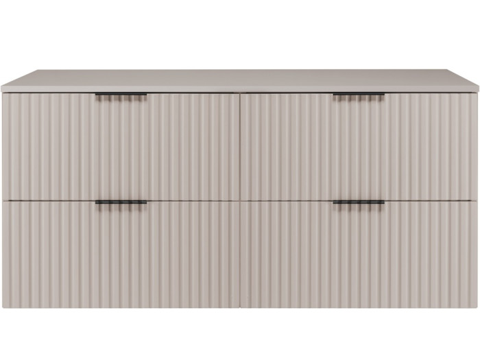 Súčasťou balenia sú dve sady úchytiek (čierna a zlatá), ktoré umožňujú prispôsobenie detailov podľa Vášho vkusu. Moderne drážkované čielka zásuviek pridávajú na modernom vzhľade. Skrinka ponúka úložný priestor v podobe štyroch veľkých zásuviek s funkciou tichého dovierania – SOFT CLOSE. Horná zásuvka je špeciálne navrhnutá pre plochý sifón, čím poskytuje maximálny úložný priestor bez zbytočných výrezov. Vrchná doska je už zahrnutá v cene. Plochý sifón a vrchné umývadlo je potrebné zakúpiť samostatne.