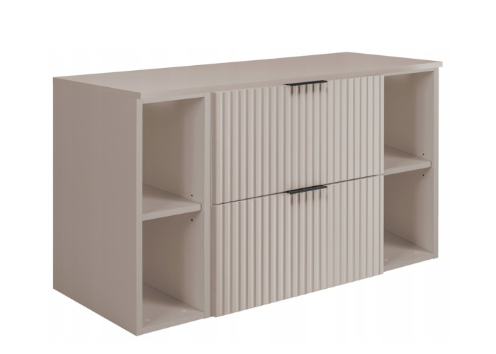 Kúpeľňová skrinka je vyrobená z kvalitnej laminovanej drevotriesky s ABS hranami. Čielka zásuviek sú z MDF materiálu odolného voči vlhkosti. Kašmírové farebné prevedenie dotvára elegantný vzhľad, ktorý krásne zapadne do konceptu béžových kúpeľní. Vnútro zásuviek je vyhotovené v svetlosivej farbe. Skrinka je určená na zavesenie na stenu, čím vytvára vzdušný dojem a zároveň uľahčuje údržbu podlahy. Moderne drážkované čielka zásuviek dodávajú štýlový dizajn. Súčasťou balenia sú dve sady úchytiek – čierne a zlaté – ktoré umožňujú jednoducho si prispôsobiť vzhľad skrinky podľa Vášho vkusu.