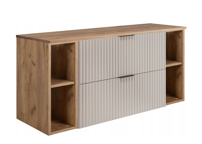Kúpeľňová skrinka je vyrobená z laminovanej drevotriesky s ABS hranami, čelné plochy zásuviek sú zhotovené z MDF materiálu. Kašmírové farebné prevedenie nádherne doplní béžové kúpeľňové priestory a dodá im nádych luxusu. Vnútro zásuviek je v svetlosivej farbe. Moderné drážkované čelá zásuviek pridávajú skrinke osobitý charakter a originálny vzhľad. Skrinka je navrhnutá na upevnenie na stenu, čo nielen uvoľní podlahový priestor a vytvorí vzdušný dojem, ale tiež zjednodušuje upratovanie. V balení nájdete dve sady úchytiek – čierne pre minimalistický štýl a zlaté pre luxusný vzhľad – ktoré Vám umožnia prispôsobiť skrinku Vášmu interiéru.