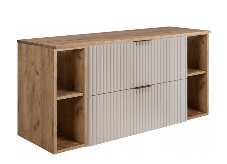 Skrinka pod umývadlo FLOW kašmír K120R80RDC v kašmírovo-dubovom farebnom prevedení je praktickým a dizajnovo atraktívnym riešením pre moderné kúpeľne. Skrinka má šírku 120 cm a je zložená zo štyroch častí: