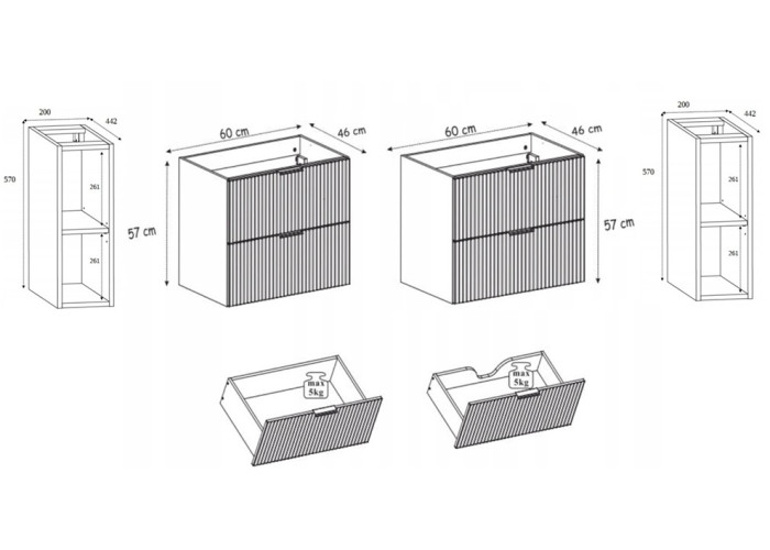 Kúpeľňová skrinka je vyrobená z kvalitnej laminovanej drevotriesky s ABS hranami, pričom predné plochy zásuviek sú z MDF materiálu odolného voči vlhkosti. Elegantné farebné prevedenie kašmír dokonale ladí s béžovými konceptami kúpeľne. Interiér zásuviek je vyhotovený v svetlosivom tóne, ktorý harmonicky dopĺňa celkový dizajn. Drážkované čelá zásuviek zabezpečujú originálny a jedinečný vzhľad, vďaka čomu skrinka dodáva kúpeľni moderný štýl. Model je určený na montáž na stenu, čo efektívne šetrí podlahovú plochu, vytvára ilúziu väčšieho priestoru a uľahčuje každodennú údržbu. V balení nájdete dve sady úchytiek – čierne a zlaté – umožňujúce doladiť skrinku presne podľa Vášho vkusu a štýlu interiéru.