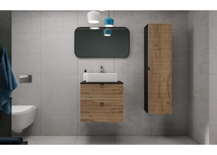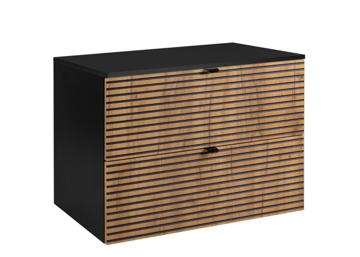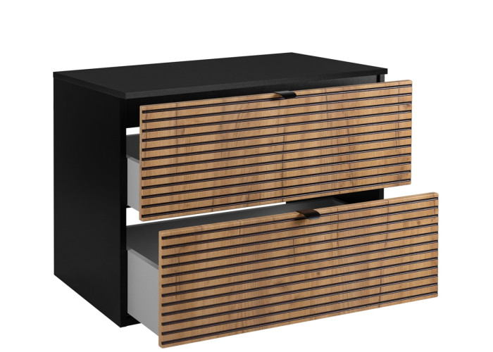 Skrinka je vybavená praktickými zásuvkami s mechanizmom Soft Close, ktorý zabezpečuje plynulé a tiché zatváranie, čo zaručuje maximálne pohodlie pri každodennom používaní. Súčasťou balenia sú dve sady úchytiek – čierne a strieborné – aby ste si mohli zvoliť farbu podľa svojho vkusu už pri montáži. Vrchná doska je súčasťou skrinky, samostatne je potrebné zakúpiť plochý sifón a vrchné umývadlo.