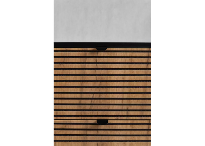 Korpus je vyrobený z kvalitnej laminovanej drevotriesky s hrúbkou 16 mm, zatiaľ čo čielka zásuviek sú z kvalitnej MDF dosky. Dekoratívne vodorovné drážky na zásuvkách podčiarkujú moderný dizajn. Technológia Soft Close zaisťuje tiché a hladké zatváranie zásuviek, čo výrazne zvyšuje pohodlie pri každodennom používaní. Súčasťou balenia sú tiež dve sady úchytiek v čiernej a striebornej farbe, ktoré Vám umožnia prispôsobiť výsledný vzhľad skrinky už pri montáži. Súčasťou skrinky je 120 cm vrchná doska, plochý sifón a vrchné umývadlo je potrebné zakúpiť samostatne.