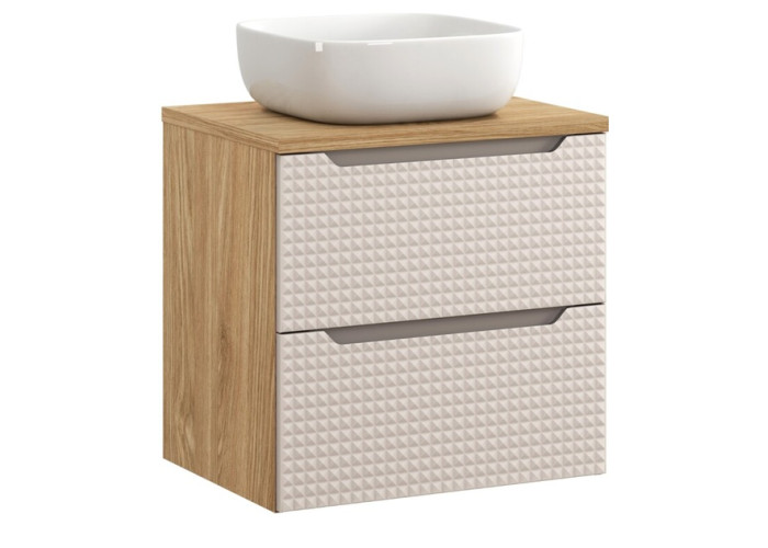Korpus skrinky je vyrobený z laminovanej drevotriesky vo farbe dub olejovaný. Dvierka skrinky sú z MDF materiálu v elegantnej béžovej matnej farbe, ktorá pridáva na elegantnosti a ladí s modernými interiérmi. Skrinka je vybavená dvomi praktickými zásuvkami s tichým uzatváraním, ktoré zamedzuje hlučnému nárazu pri zatváraní a zvyšuje komfort používania. Skrinku je potrebné zavesiť na stenu, čo šetrí miesto a podčiarkuje jej čistý vzhľad. Integrované úchytky dodávajú skrinke minimalistický a zároveň funkčný dizajn.