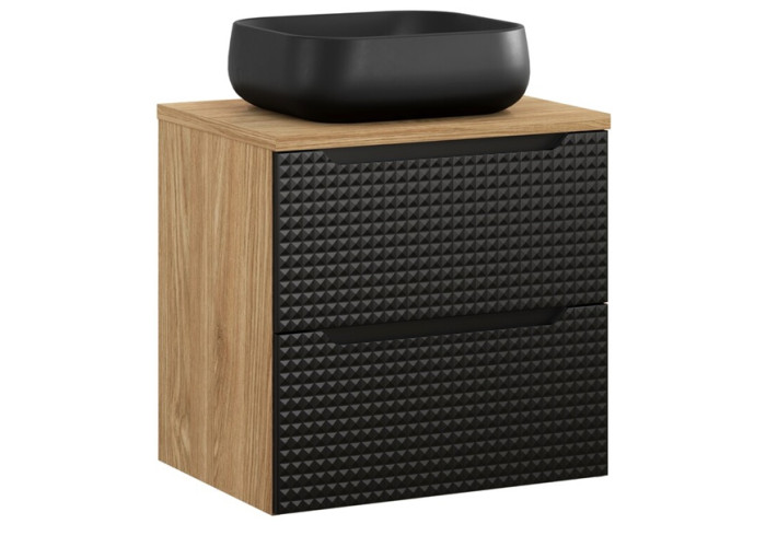 Korpus skrinky je vyrobený z laminovanej drevotriesky vo farbe dub olejovaný. Dvierka skrinky sú z MDF materiálu v elegantnej čiernej matnej farbe, ktorá pridáva na elegantnosti a ladí s modernými interiérmi. Skrinka je vybavená dvomi praktickými zásuvkami, ktoré majú tiché uzatváranie, čo zamedzuje hlučnému nárazu pri zatváraní a zvyšuje komfort používania. Skrinku je potrebné zavesiť na stenu, čo šetrí miesto a podčiarkuje jej čistý vzhľad. Integrované úchytky dodávajú skrinke minimalistický a zároveň funkčný dizajn.