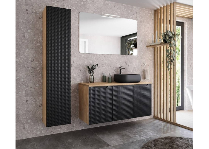 Praktická závesná skrinka s umývadlom v šírke 90 cm LUXOR BLACK je ideálnym riešením pre moderné kúpeľne. Táto závesná skrinka pod umývadlo ponúka efektívne využitie priestoru. Korpus je vyrobený z kvalitnej laminovanej drevotriesky vo farbe dub olejovaný, čo dodáva produktu prírodný a elegantný vzhľad. Dvierka sú z MDF materiálu v čiernej matnej farbe a prispievajú k luxusnému dojmu každej kúpeľne. Kúpeľňový set sa skladá z troch častí: