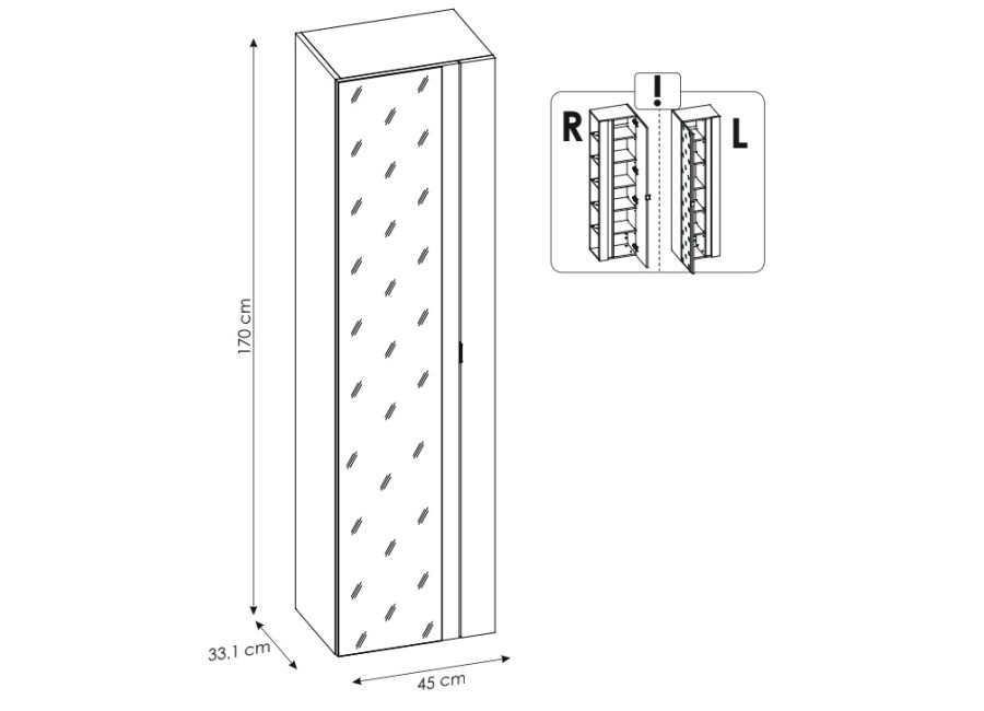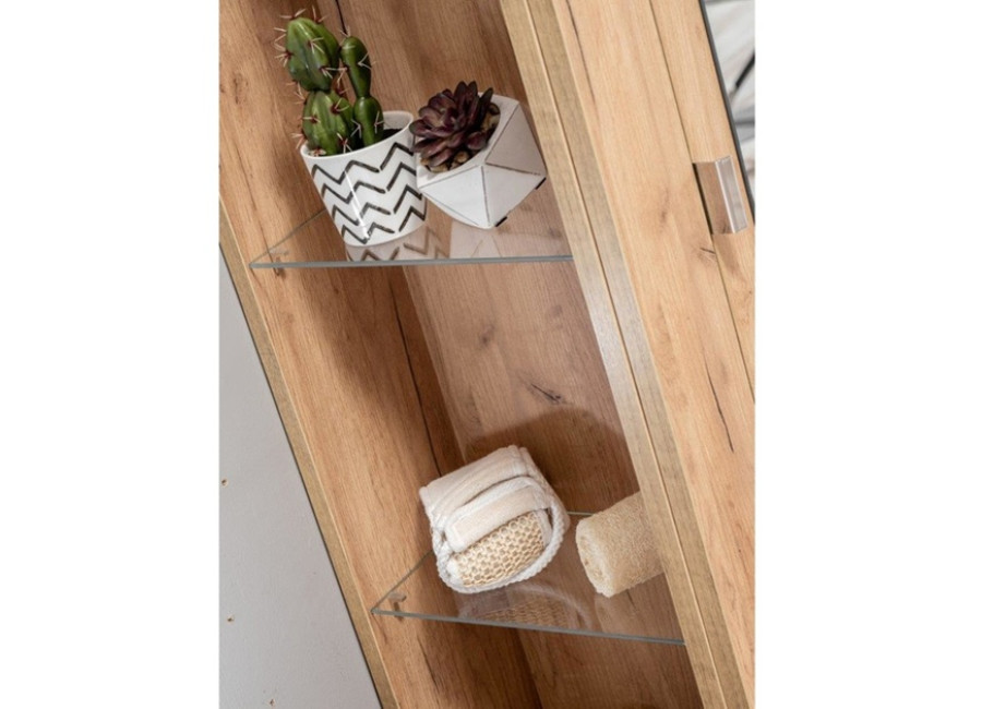 Vysoká skrinka so zrkadlom je navrhnutá tak, aby bola maximálne praktická. Vnútro skrinky obsahuje 5 drevených a 5 sklenených políc v bočnej časti skrinky, ktoré poskytujú dostatok priestoru pre usporiadanie všetkých Vašich kúpeľňových potrieb. Praktické tiché dovieranie dvierok je bonusom, ktorý oceníte vždy, keď skrinku používate. Univerzálne prevedenie skrinky umožňuje montáž dvierok na ľavú aj pravú stranu.