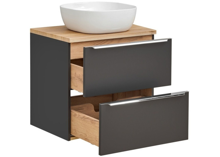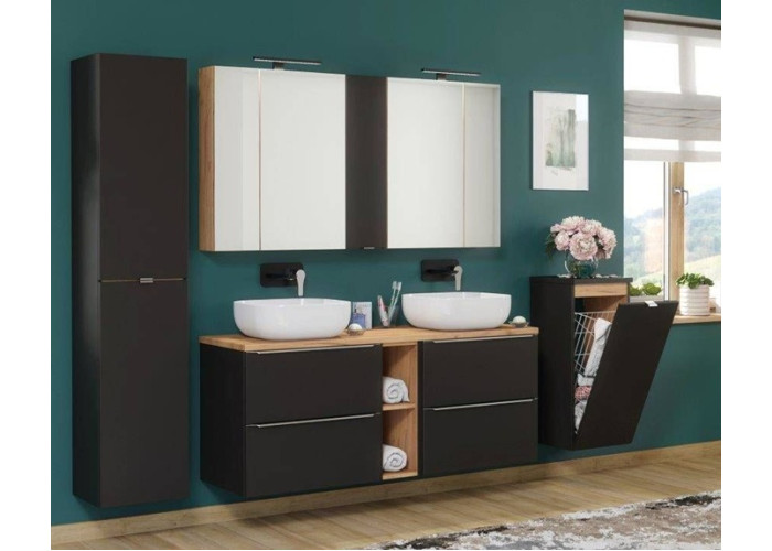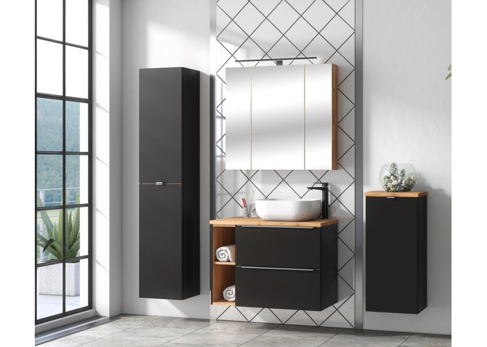 Závesná skrinka v šírke 60 cm ponúka dostatočný úložný priestor, no zároveň sa hodí aj do menších kúpeľní. Vyrobená je z laminovanej drevotriesky s ABS hranami, pričom čielka sú z MDF materiálu, čo zabezpečuje odolnosť voči vlhkosti. Kovové chrómové úchytky dodávajú celému dizajnu nádych luxusu a zároveň zaručujú komfortné používanie. Vyrába sa vo farebnej kombinácii čierna matná a dub craft zlatý. Kúpeľňová skrinka je určená na zavesenie na stenu, čo umožňuje jednoduchú údržbu podlahy pod ňou. Disponuje dvoma zásuvkami vybavené funkciou tichého zatvárania SOFT CLOSE.