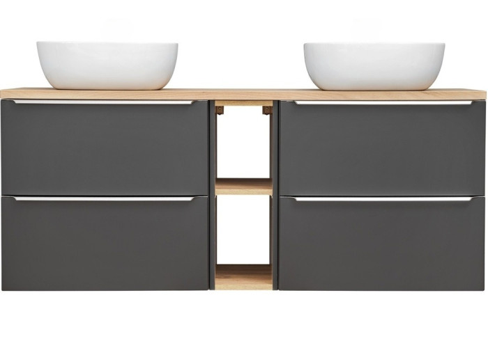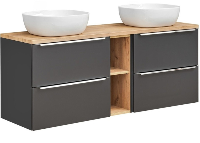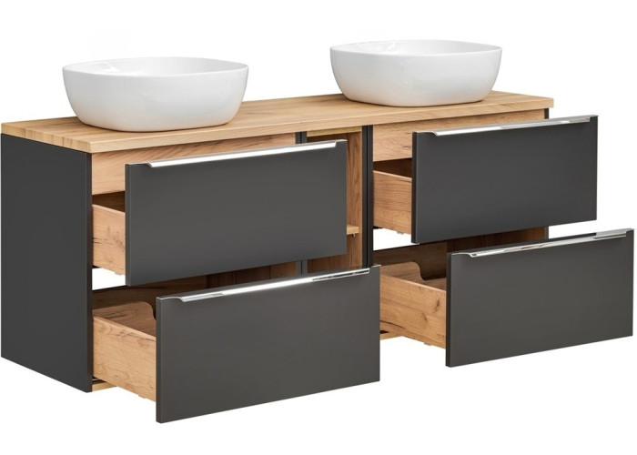 Je vyrobená z laminovanej drevotriesky s ABS hranami, čielka zásuviek z MDF materiálu. Kovové chrómové úchytky podčiarkujú celkový dizajn a pridávajú moderný vzhľad. Kombinácia matnej čiernej farby a dubu craft prináša moderný a nadčasový štýl, ktorý sa ľahko hodí do rôznych typov kúpeľní. Závesná skrinka obsahuje štyri zásuvky vybavené mechanizmom tichého zatvárania SOFT CLOSE, pričom horná zásuvka je špeciálne upravená, aby obchádzala sifón. Umývadlo a sifón je potrebné dokúpiť samostatne.