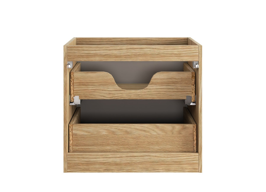 Farebná kombinácia béžovej matnej a dubu olejovaného vytvára teplý a útulný dojem. Súčasťou dizajnu sú integrované úchytky, ktoré zabezpečujú čistý, minimalistický vzhľad bez rušivých prvkov. Skrinka je navrhnutá na zavesenie na stenu, čo uľahčuje údržbu podlahovej plochy pod skrinkou. Má dve zásuvky vybavené funkciou tichého zatvárania, ktoré umožňujú pohodlné každodenné používanie a zaručujú plynulý chod zásuviek. Ku skrinke je potrebné dokúpiť plochý sifón, vrchná doska ani umývadlo nie sú zahrnuté v cene. Toto však vytvára možnosť výberu medzi zápustným umývadlom alebo vrchnou doskou s vrchným umývadlom, čím si môžete prispôsobiť kúpeľňu presne podľa svojich potrieb.