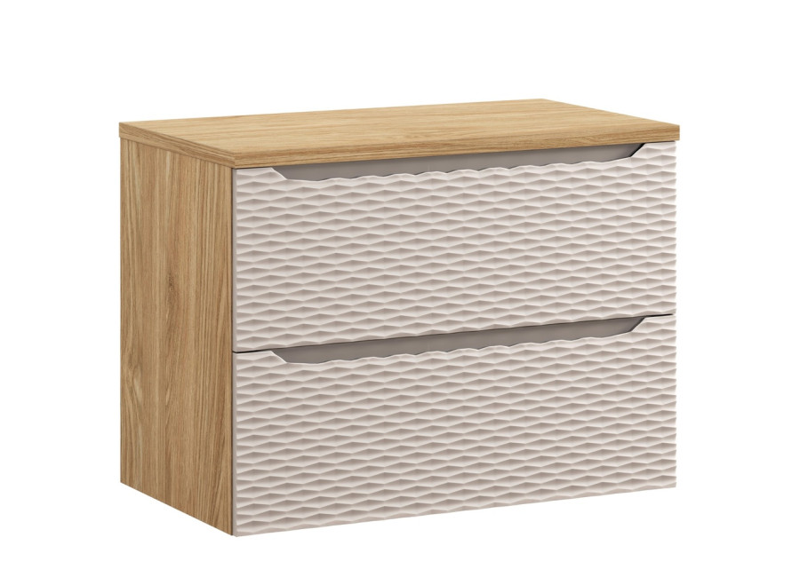 Skrinka pod umývadlo s vrchnou doskou OCEAN Beige 82-80-2S-D je elegantný a praktický prvok kúpeľňového nábytku navrhnutý pre moderné interiéry. Kúpeľňová skrinka pod umývadlo v šírke 80 cm je vyrobená z laminovanej drevotriesky s ABS hranami, pričom dvierka sú z MDF materiálu. Skrinky do kúpeľne z kolekcie OCEAN zaujmú svojim prepracovaným dizajnom – trojrozmerné horizontálne línie na dvierkach pripomínajú pohyb oceánskej hladiny, čím dodávajú kúpeľňovým skrinkám originálny vzhľad.