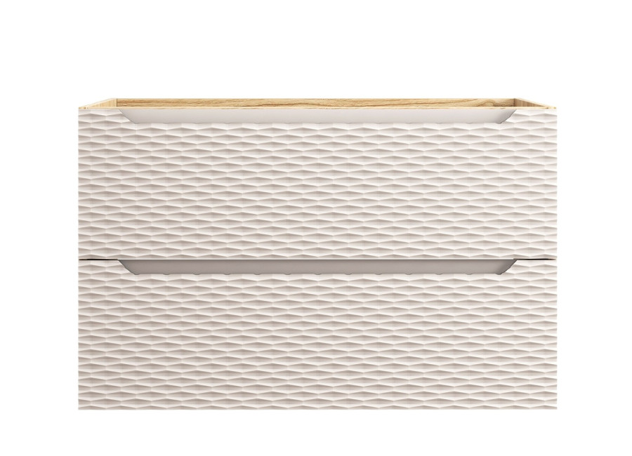 Skrinka pod umývadlo s vrchnou doskou OCEAN Beige 82-90-2S-D je elegantným a funkčným doplnkom pre každý moderný kúpeľňový interiér. Tento kvalitný kúpeľňový nábytok spája praktickosť s estetickou hodnotou, čím poskytuje štýlové riešenie pre usporiadanie a úložný priestor vo Vašej kúpeľni. Kúpeľňová skrinka pod umývadlo v šírke 90 cm je vyrobená z laminovanej drevotriesky, pričom jej odolnosť zvyšujú ABS hrany. Čielka zásuviek sú zhotovené z MDF materiálu a majú trojrozmerné horizontálne línie, ktoré evokujú pohyb oceánskej hladiny, čím prinášajú do priestoru jemný nádych prírody.