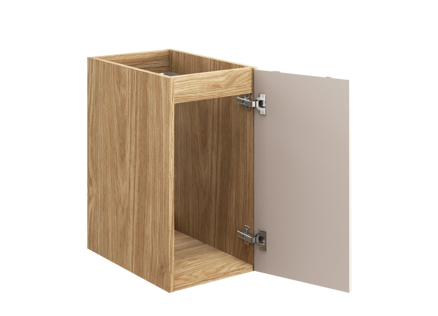 Je vyrobená z laminovanej drevotriesky s odolnými ABS hranami, dvierka sú z MDF materiálu, čo zvyšuje ich odolnosť voči vlhkosti. Dizajnovým prvkom, ktorý upúta pozornosť, sú trojrozmerné horizontálne línie na dvierkach. Tieto línie pripomínajú pohyb hladiny oceánu a dodávajú skrinke unikátny charakter. Skrinka je vyhotovená vo farebnom prevedení béžová matná v kombinácii s dubom olejovaným, čo umožňuje ľahké začlenenie do rôznych štýlov kúpeľňového interiéru. Integrované úchytky prispievajú k minimalistickému vzhľadu.