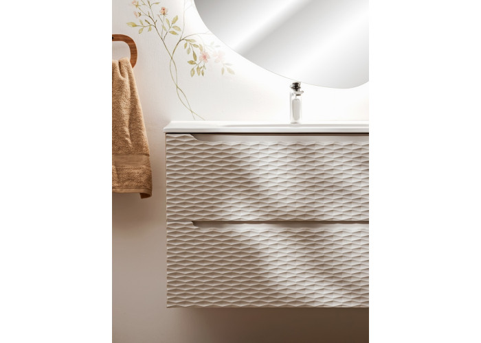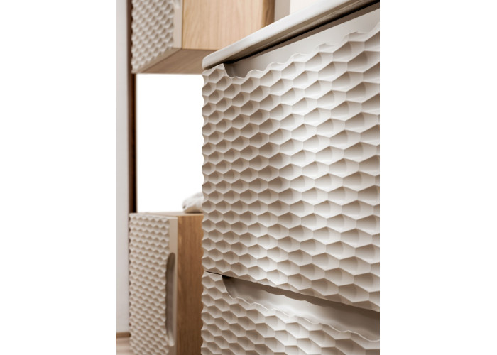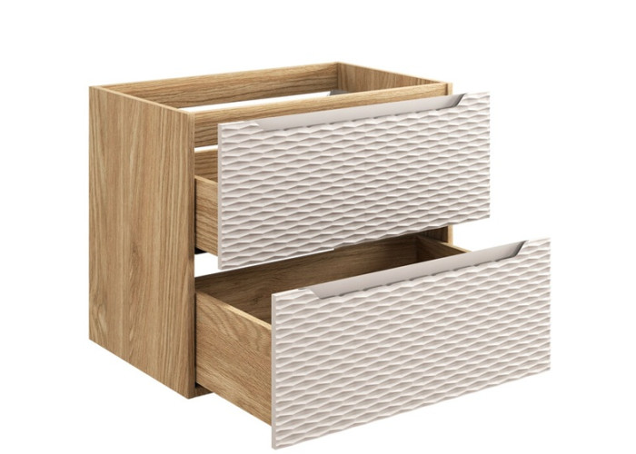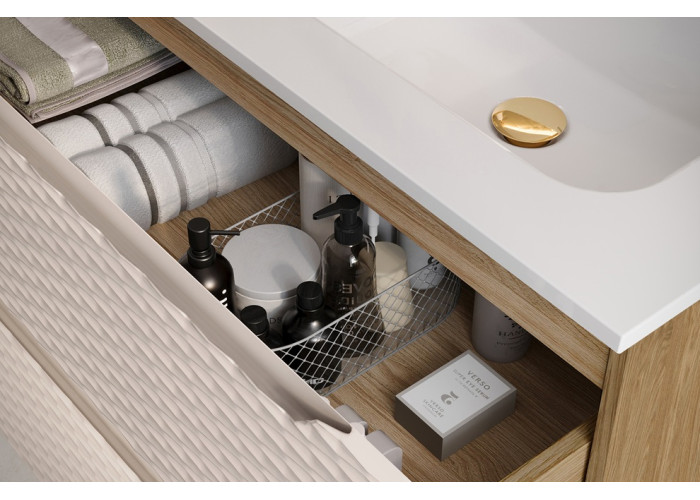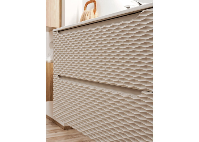 Vyrobená je z kvalitnej laminovanej drevotriesky s ABS hranami, pričom čielka zásuviek sú z MDF materiálu. Skrinka je zameraná na detaily, o čom svedčia trojrozmerné horizontálne línie na dvierkach, ktoré pripomínajú pohyb oceánskej hladiny. Integrované úchytky prispievajú k jej čistému a elegantnému vzhľadu. Farebné prevedenie v kombinácii béžovej matnej a dubu olejovaného dodáva skrinke štýlový a naturálny vzhľad, ktorý sa hodí do rozličných typov interiérov kúpeľní. Skrinka je určená na zavesenie na stenu, čím Vám uľahčí čistenie podlahy.