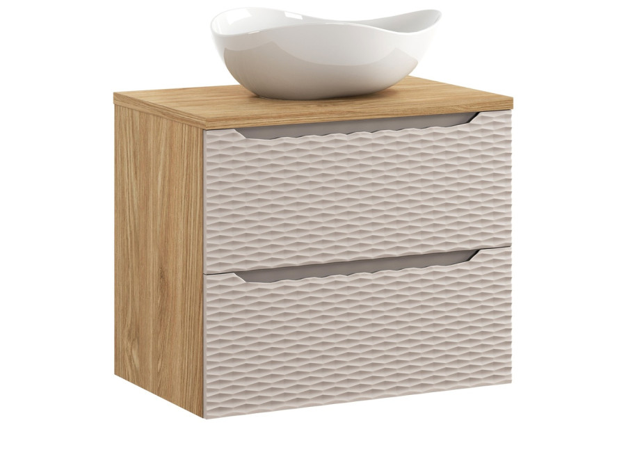 Vyrobená je z kvalitnej laminovanej drevotriesky s ABS hranami, pričom čielka zásuviek sú z MDF materiálu. Skrinka je zameraná na detaily, o čom svedčia trojrozmerné horizontálne línie na dvierkach, ktoré pripomínajú pohyb oceánskej hladiny. Integrované úchytky prispievajú k jej čistému a elegantnému vzhľadu. Farebné prevedenie v kombinácii béžovej matnej a dubu olejovaného dodáva skrinke štýlový a naturálny vzhľad, ktorý sa hodí do rozličných typov interiérov kúpeľní. Skrinka je určená na zavesenie na stenu, čím Vám uľahčí čistenie podlahy.
