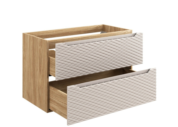 Skrinka je určená na zavesenie na stenu, čo z nej robí praktické a moderné riešenie pre optimalizáciu priestoru vo Vašej kúpeľni. Jej dve zásuvky sú vybavené funkciou tichého zatvárania, vďaka ktorej je každodenné používanie pohodlné. Integrované úchytky zvyšujú vizuálnu čistotu dizajnu a farebné prevedenie v béžovej matnej a dub olejovaný dodáva kúpeľni teplý a prirodzený vzhľad.