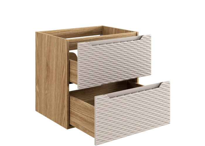 Je vyrobená z laminovanej drevotriesky s odolnými ABS hranami, dvierka sú z MDF materiálu, čo zvyšuje ich odolnosť voči vlhkosti. Dizajnovým prvkom, ktorý upúta pozornosť, sú trojrozmerné horizontálne línie na dvierkach. Tieto línie pripomínajú pohyb hladiny oceánu a dodávajú skrinke unikátny charakter. Skrinka je vyhotovená vo farebnom prevedení béžová matná v kombinácii s dubom olejovaným, čo umožňuje ľahké začlenenie do rôznych štýlov kúpeľňového interiéru. Integrované úchytky prispievajú k minimalistickému vzhľadu.