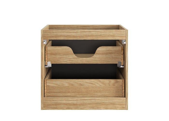 Farebné prevedenie čierna matná a dub olejovaný podčiarkuje jej moderný vzhľad. Skrinka je určená na zavesenie na stenu, takže priestor pod ňou zostáva voľný. Ponúka dve zásuvky vybavené funkciou tichého zatvárania a pre maximálne využitie hornej zásuvky odporúčame zakúpiť plochý sifón.