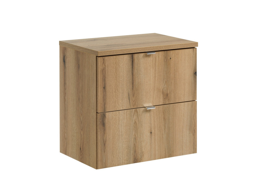 Skrinka pod umývadlo s vrchnou doskou NOVA dub 82-60-2S-DD je praktickým riešením pre modernú kúpeľňu. Tento kvalitný kúpeľňový nábytok je ideálny pre všetkých, ktorí hľadajú funkčné skrinky do kúpeľne, ktoré skrášlia Vašu kúpeľňu. Skrinka pod umývadlo v šírke 60 cm je vyrobená z laminovanej drevotriesky s ABS hranami, čo zabezpečuje odolnosť voči vlhkosti. Minimalistické hladké predné plochy dodávajú skrinke moderný vzhľad a hliníkové úchytky s chrómovým leskom nádych elegancie.