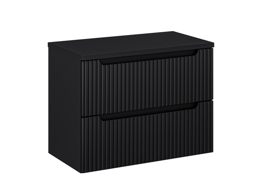 Skrinka pod umývadlo s vrchnou doskou NOVA Black 82-80-2S-DC je elegantným doplnkom do modernej kúpeľne. Ide o skrinku pod umývadlo v šírke 80 cm, ktorá ponúka praktický úložný priestor a zároveň vnáša do interiéru výrazný dizajnový prvok. Tento kúpeľňový nábytok je vyrobený z kvalitnej laminovanej drevotriesky a ABS hranami, zatiaľ čo čielka zásuviek sú z MDF materiálu. Predné plochy zásuviek sú moderne zdobené zvislými pásikmi a dopĺňajú ich integrované úchytky. Farebné prevedenie čierna matná dodáva skrinke elegantný vzhľad a dobre sa kombinuje s ostatnými prvkami nábytku do kúpeľne.