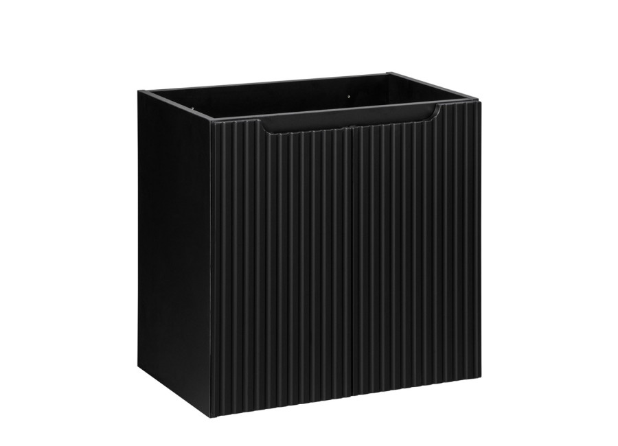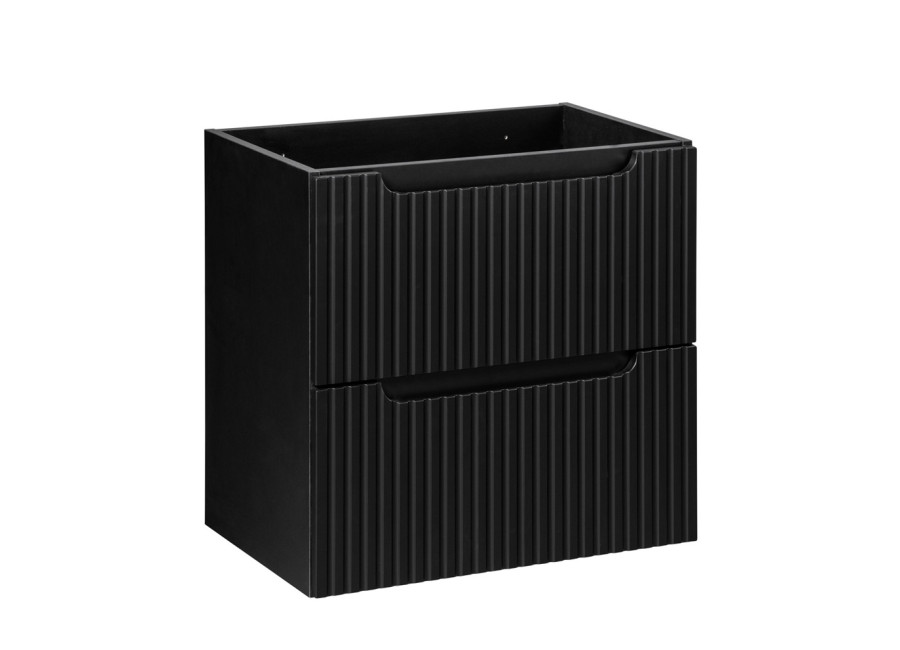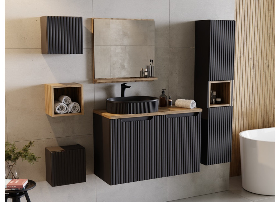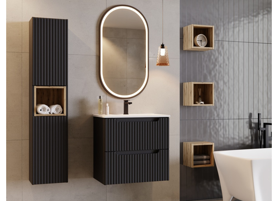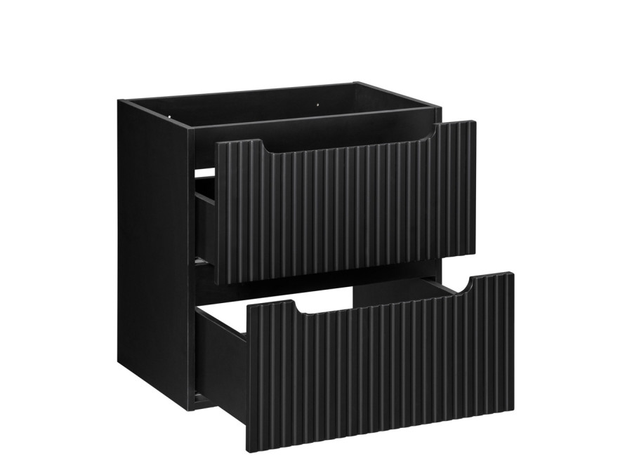 Je vyrobená z kvalitnej laminovanej drevotriesky s ABS hranami. Čielka zásuviek sú z MDF materiálu a vyznačujú sa moderne zdobenými prednými plochami so zvislými pásikmi. Praktické integrované úchytky zachovávajú čistý vzhľad a farebné prevedenie čierna matná sa hodí do rôznorodých interiérov. Skrinka je určená na zavesenie na stenu, čo zjednoduší upratovanie podlahy v kúpeľni a vytvorí dojem väčšieho priestoru. Zásuvky a dvierka sú vybavené funkciou tichého dovierania, ktorá zlepšuje komfort pri každodennom používaní. K tejto skrinke pod umývadlo odporúčame zakúpiť plochý sifón, aby ste mohli zásuvku a policu využiť na maximum.