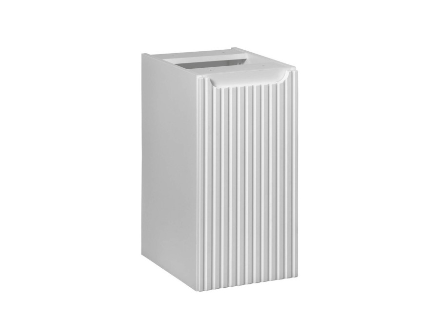 Skrinka je vyrobená z kvalitnej laminovanej drevotriesky, pričom ABS hrany zabezpečujú jej odolnosť voči mechanickému poškodeniu a vlhkosti. Dvierka sú z MDF materiálu a ich predné plochy sú zdobené jemnými zvislými pásikmi, ktoré dodávajú nábytku eleganciu. Farebné prevedenie v bielej matnej ladí s modernými aj klasickými kúpeľňami. Integrovaná úchytka zaisťuje komfortné používanie a nenarúša čistý dizajn. Skrinka je navrhnutá na zavesenie na stenu, čím šetrí miesto a zároveň uľahčuje údržbu podlahy v kúpeľni. Dvierka sú vybavené tichým dovieraním, ktoré prispieva k pohodlnému a tichému každodennému používaniu.