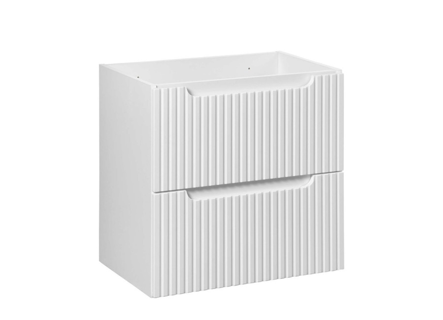 Predné plochy skrinky sú zdobené jemnými zvislými pásikmi. Integrované úchytky dopĺňajú dizajn a zabezpečujú pohodlné používanie. Skrinka je navrhnutá na zavesenie na stenu, vďaka čomu umožňuje jednoduché čistenie podlahového priestoru. Zásuvková skrinka pod umývadlo ponúka dve zásuvky vybavené funkciou tichého dovierania. Na maximálne využitie úložného priestoru vrchnej zásuvky odporúčame zakúpenie plochého sifónu.