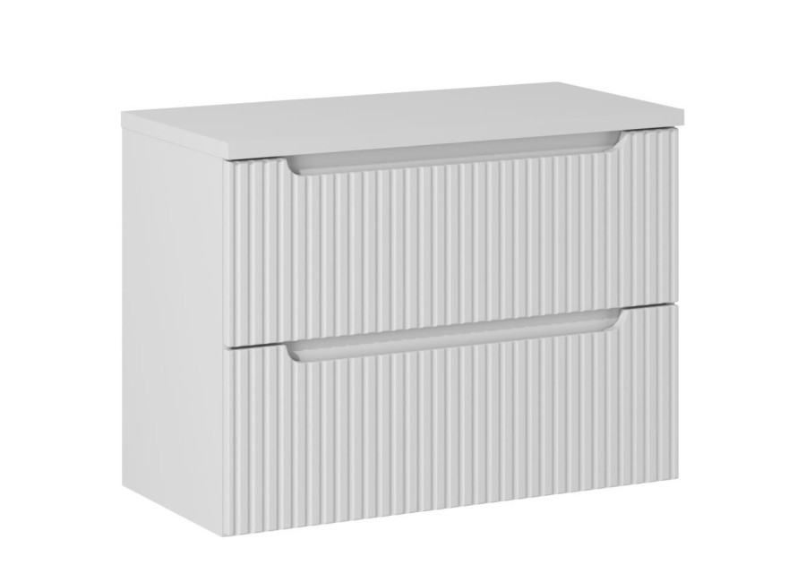 Predstavujeme Vám skrinku pod umývadlo s doskou NOVA WHITE 82-80-2S-DB, ktorá je súčasťou modernej kolekcie kúpeľňového nábytku navrhnutého s dôrazom na funkčnosť a moderný dizajn. Ide o praktickú zásuvkovú skrinku pod umývadlo v šírke 80 cm, ktorá poskytuje štedrý úložný priestor. Korpus skrinky je vyrobený z laminovanej drevotriesky s ABS hranami, čielka zásuviek sú z frézovaného MDF materiálu. Charakteristickým prvkom dizajnu sú predné plochy, ktoré sú elegantne zdobené jemnými zvislými pásikmi. Minimalistický vzhľad dotvárajú integrované úchytky.