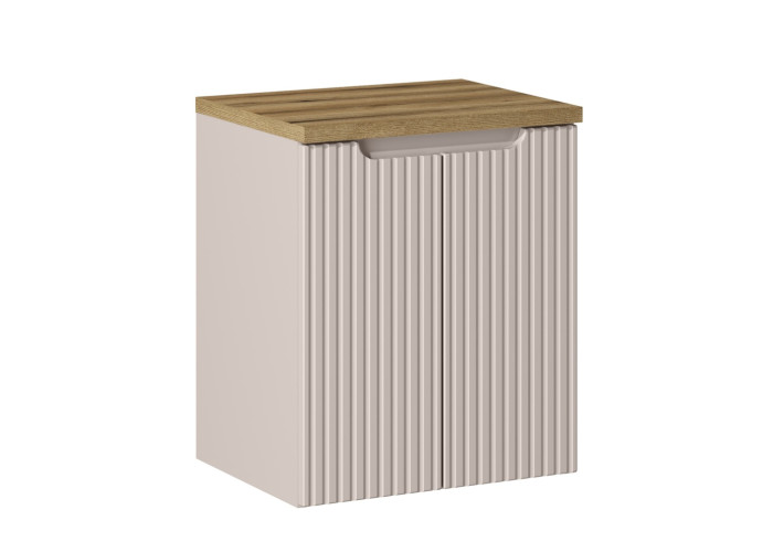 Kúpeľňová skrinka s doskou NOVA CASHMERE 82-50-2D-DD je elegantným a praktickým riešením do každej modernej kúpeľne. Skrinka pod umývadlo v šírke 50 cm je vyrobená z laminovanej drevotriesky, ktorá je opatrená ABS hranami. Predné dvierka z MDF materiálu sú zdobené jemnými zvislými pásikmi, čo dodáva celej skrinke elegantný vzhľad. Integrované úchytky zabezpečujú čisté línie a moderný dizajn. Farebné prevedenie kašmír (béžová) ponúka univerzálny štýl, ktorý sa ľahko kombinuje s ostatným nábytkom do kúpeľne. Vrchná doska je vo farbe dub evoke.