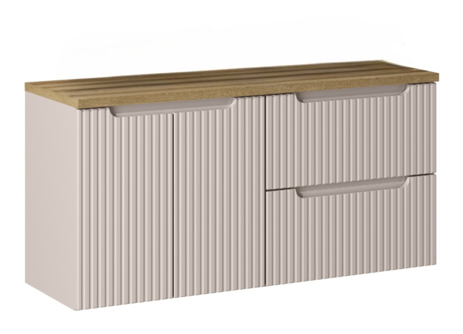 Béžový kúpeľňový nábytok v šírke 120 cm poskytuje dostatok úložného priestoru a je navrhnutý tak, aby spĺňal potreby moderného interiéru. Kúpeľňové skrinky sú vyrobené z kvalitnej laminovanej drevotriesky s ABS hranami a čelá zásuviek sú zhotovené z MDF materiálu, čo zaručuje odolnosť voči vlhkosti a dlhú životnosť. Predné plochy skrinky sú zdobené zvislými pásikmi. Integrované úchytky ešte viac zvýrazňujú jednoduchý a čistý dizajn.