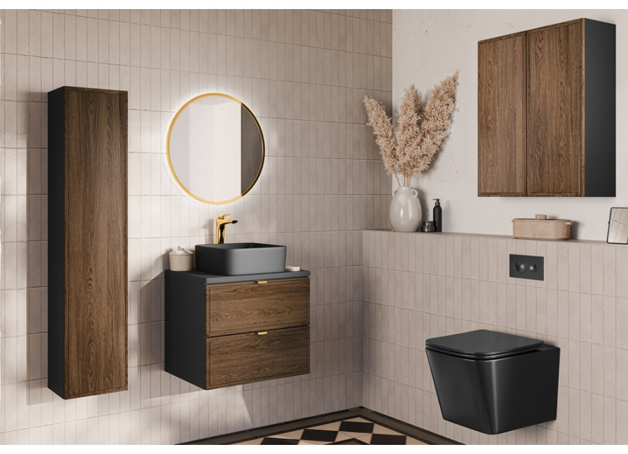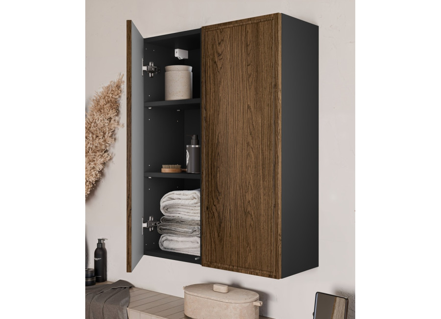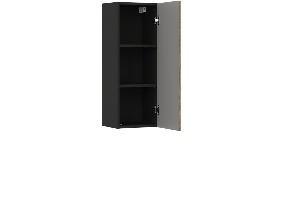 Dizajn skrinky v kombinácii farieb dub casella a čierna matná pôsobí elegantne a ľahko sa začlení do rôznych interiérových prevedení. Skrinka je určená na montáž na stenu.