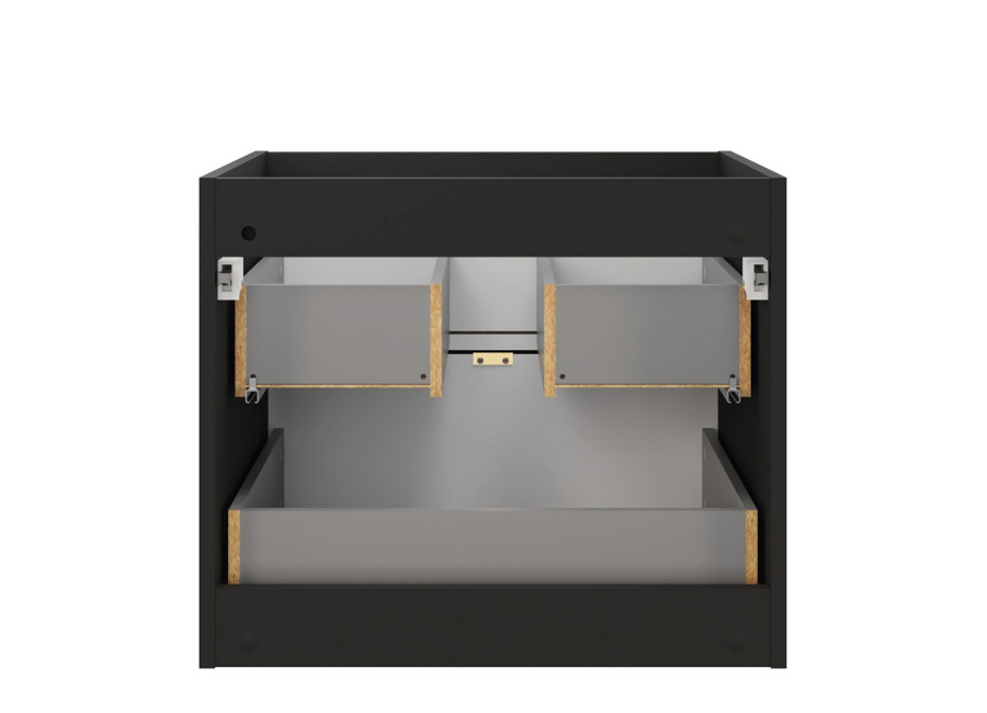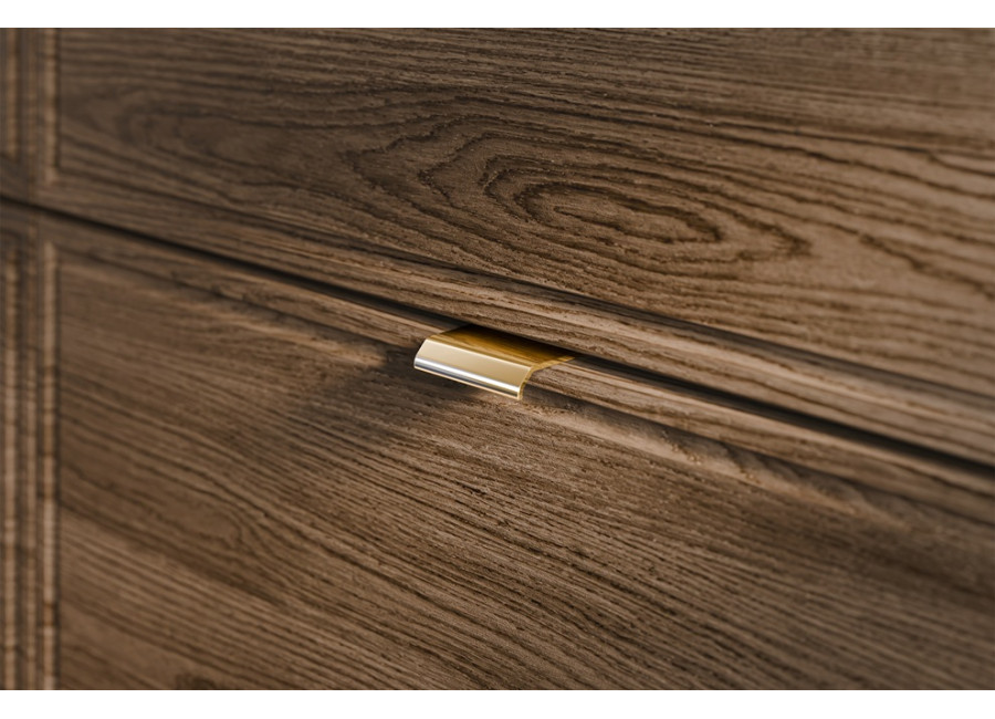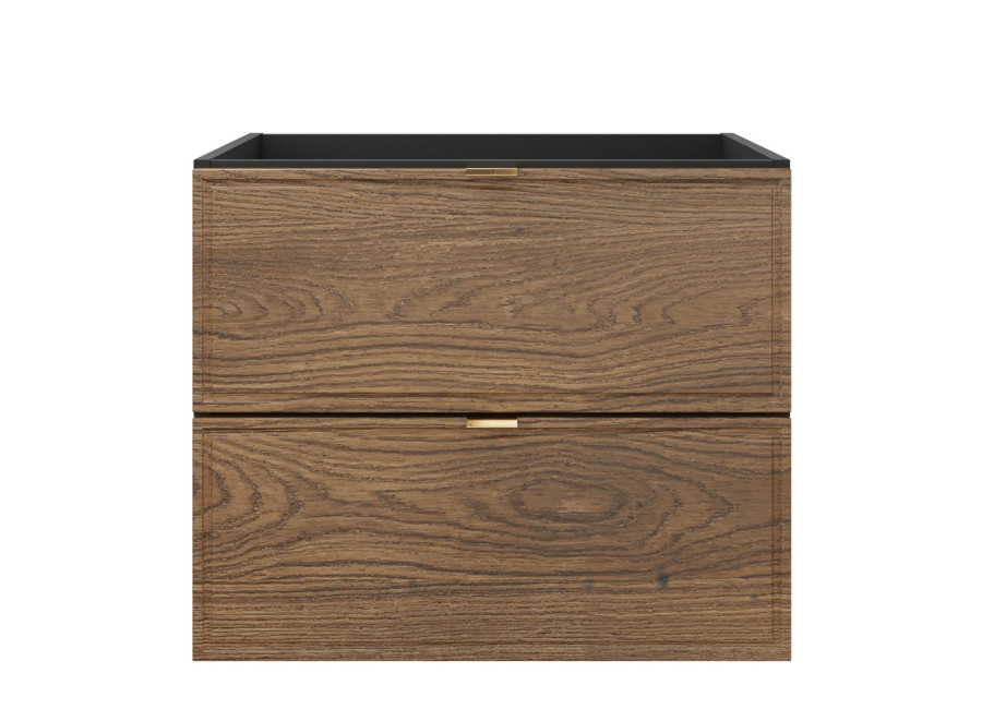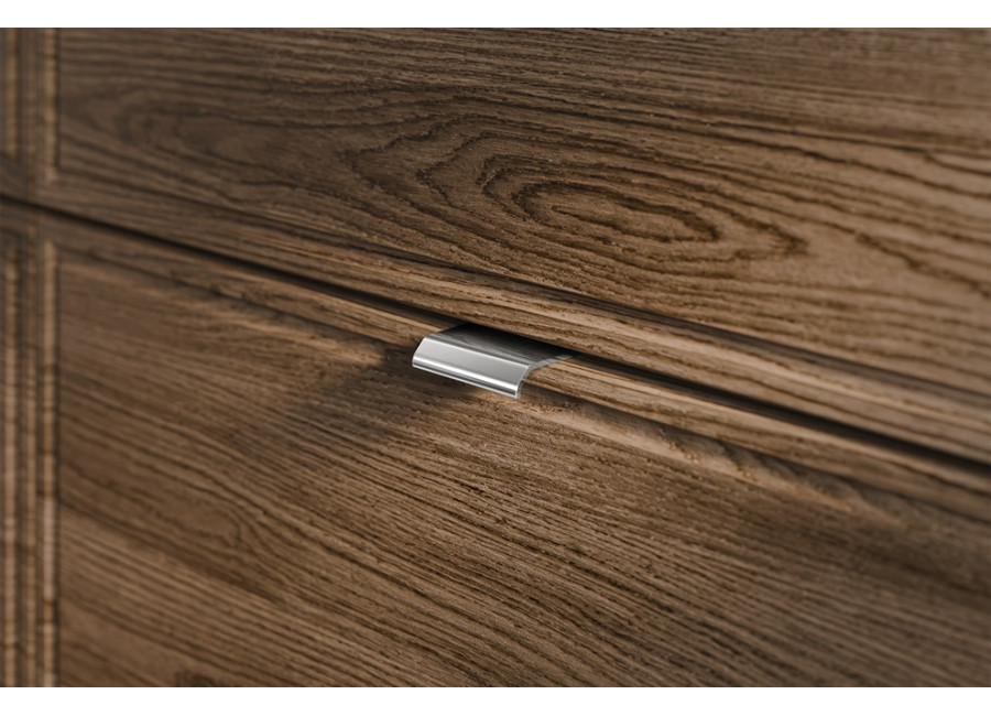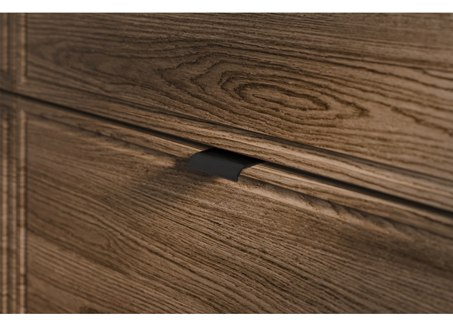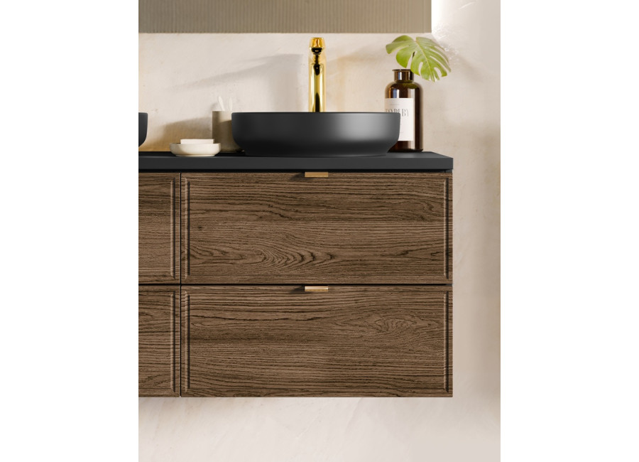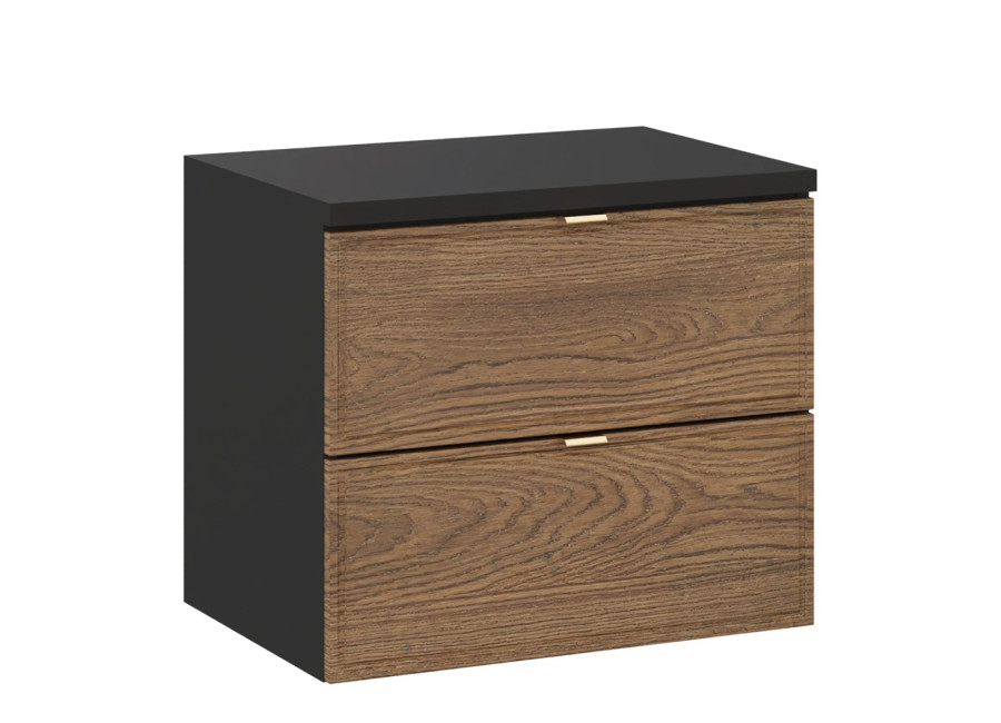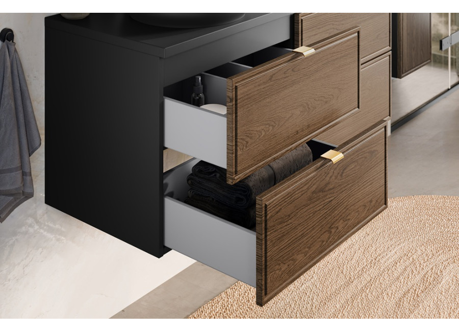 Kúpeľňová skrinka disponuje dvomi zásuvkami, ktorých predné plochy sú jednoducho zdobené a súčasťou sú tri farebné sady úchytiek – zlatá lesklá, chrómová lesklá a čierna matná. Obe zásuvky sú vybavené funkciou tichého dovierania. Vrchná zásuvka je delená, čo umožňuje namontovanie sifónu. Skrinka je dostupná vo farebnom prevedení dub Casella + čierna matná, čo jej dodáva elegantný a moderný vzhľad. Je určená na zavesenie na stenu.