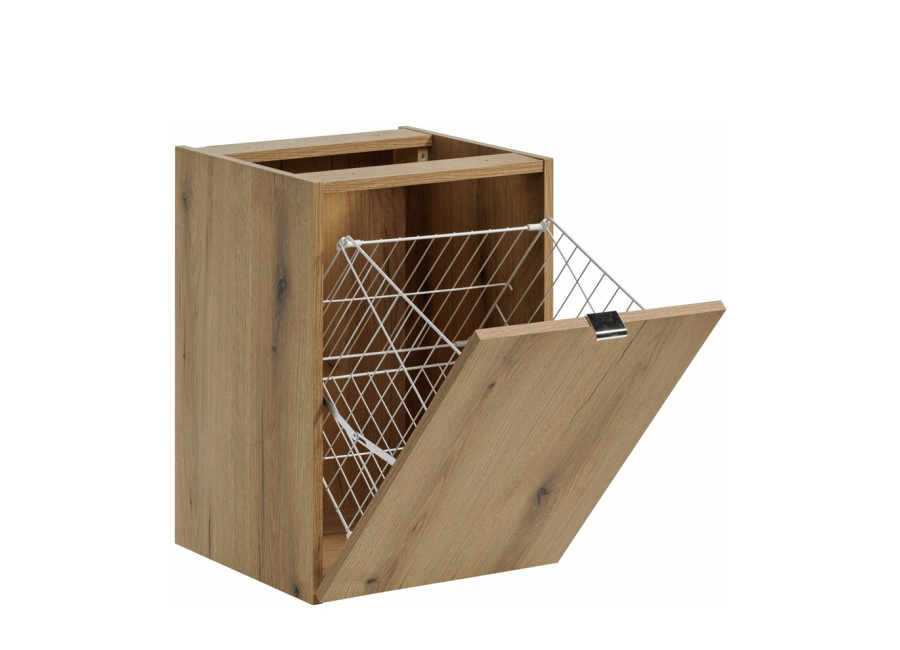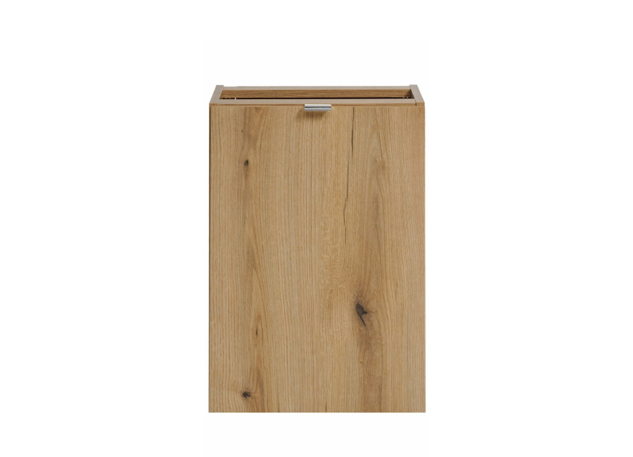Predstavujeme Vám kúpeľňovú skrinku NOVA dub 81-40-1DK, ktorá je praktickým a elegantným riešením pre moderný kúpeľňový nábytok. Skrinka do kúpeľne v šírke 40 cm je navrhnutá primárne ako spojovacia alebo rozširujúca skrinka k umývadlovým skrinkám z rovnakej kolekcie a jej súčasťou je kôš na prádlo. Umožňuje efektívne vyplniť priestor a rozšíriť úložné možnosti vedľa umývadla, prípadne poslúži ako samostatný úložný prvok v menších priestoroch.
