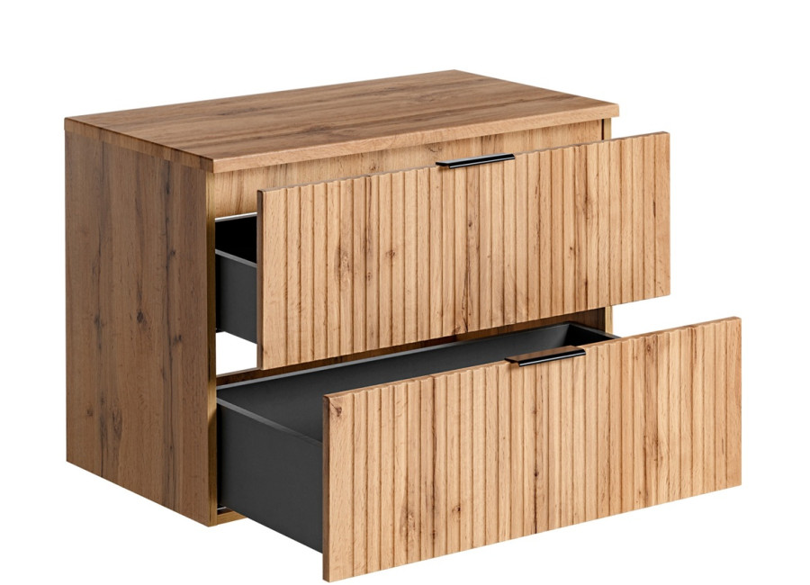 Skrinka pod umývadlo s doskou v šírke 80 cm ADEL dub 82-80-B-2D-DD patrí medzi kúpeľňový nábytok, ktorý kombinuje praktickosť a moderný vzhľad. Vyrobená je z kvalitnej laminovanej drevotriesky s ABS hranami a dvierkami z MDF materiálu, čo zaručuje jej odolnosť voči vlhkosti. Skrinka sa pýši elegantným zvislým drážkovaním na čielkach zásuviek a farebným prevedením dub wotan, pričom vnútro zásuviek je ladené do sivej farby. Je určená na zavesenie na stenu a obsahuje dve zásuvky vybavené funkciou tichého dovierania.